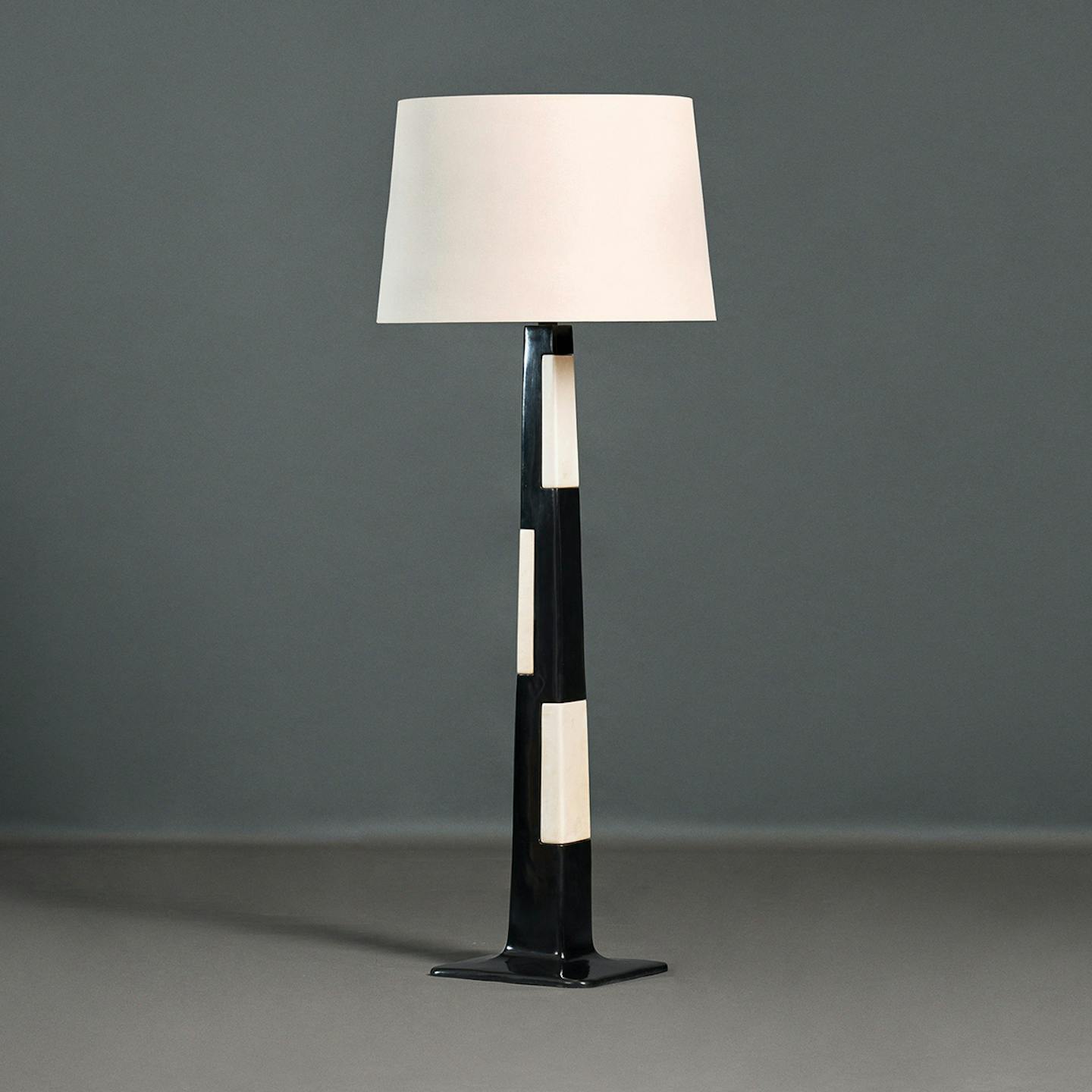Inspired by the acrolith sculptures of ancient Greece that beautifully bring together precious and simpler natural materials, a black bronze sculptural tower is completed with individually hand-shaped parchment-wrapped blocks to create a unique and striking light.