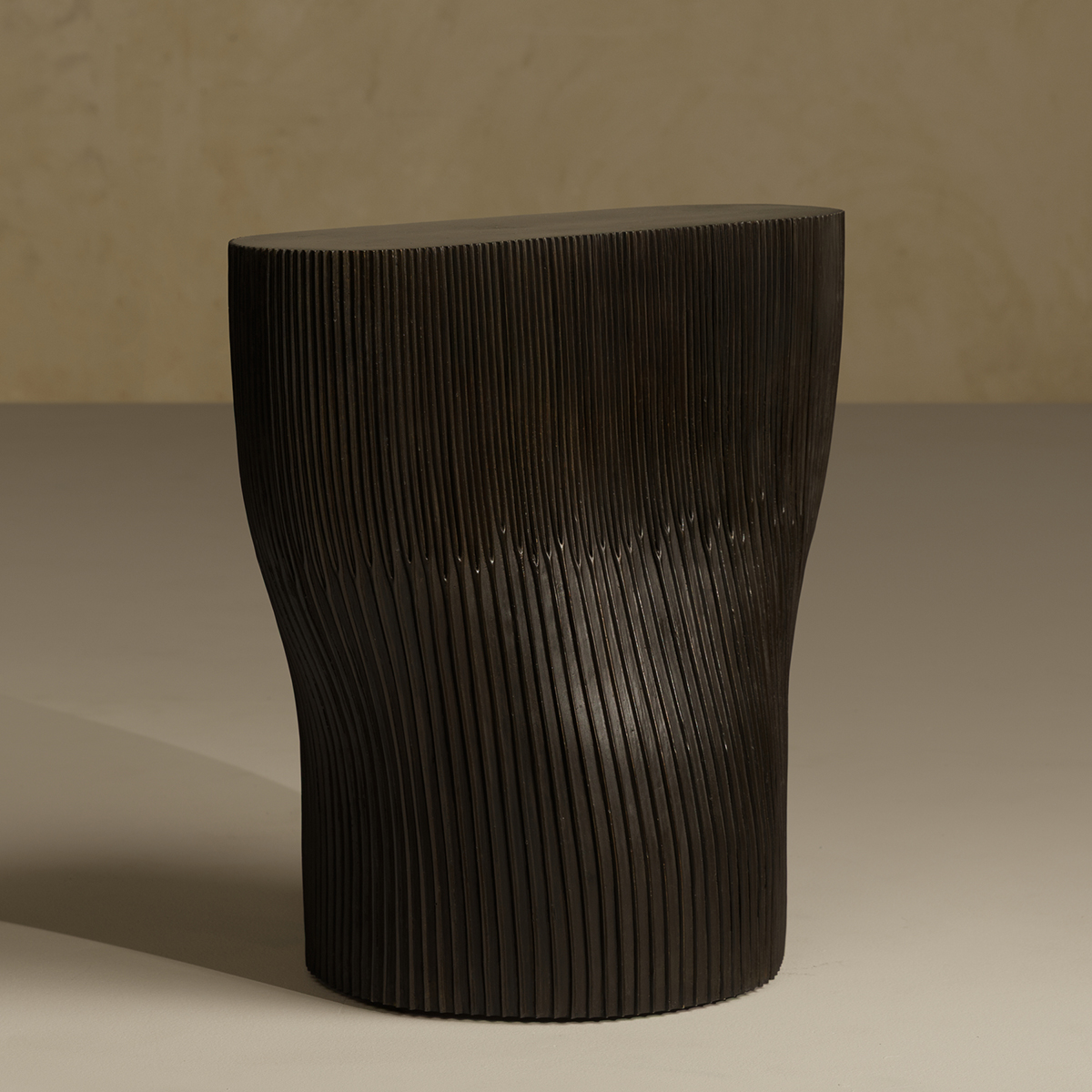 A reduction of logs; the bark formed by hand as an expanding graphic line; protective ribs that in our side tables, delight the sitter. Fine lines were rolled in wax and slowly worked to create the unique texture on these cast bronze spot/side tables. Named Trunk and Bough after Tennyson's poem, The Oak, these sculptural side tables bring natural shapes and fine texture to seating areas.