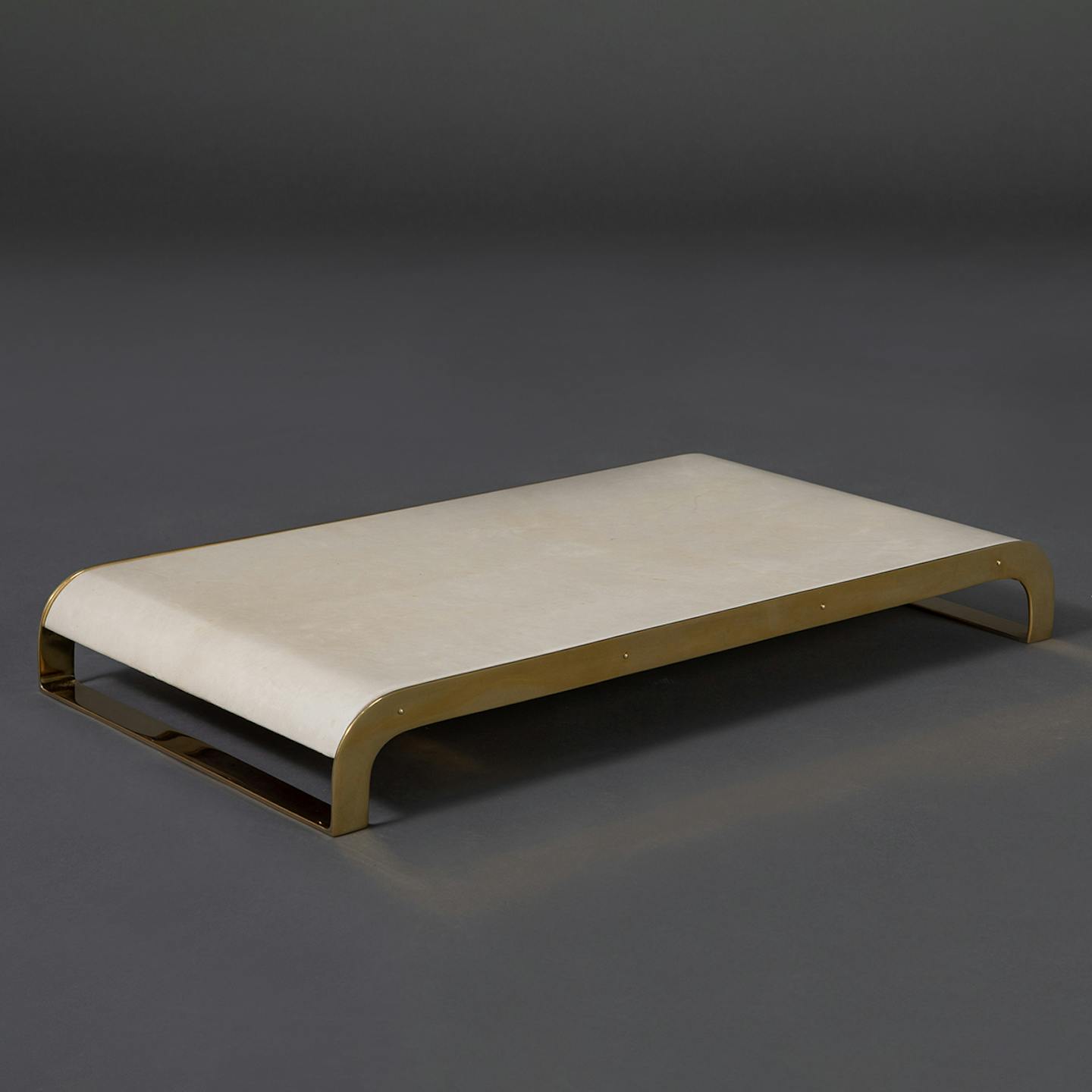 Inspired by the forms of cars of the 1930's, an elegant tray is made from natural parchment stretched over a curving form and supported by solid brass.