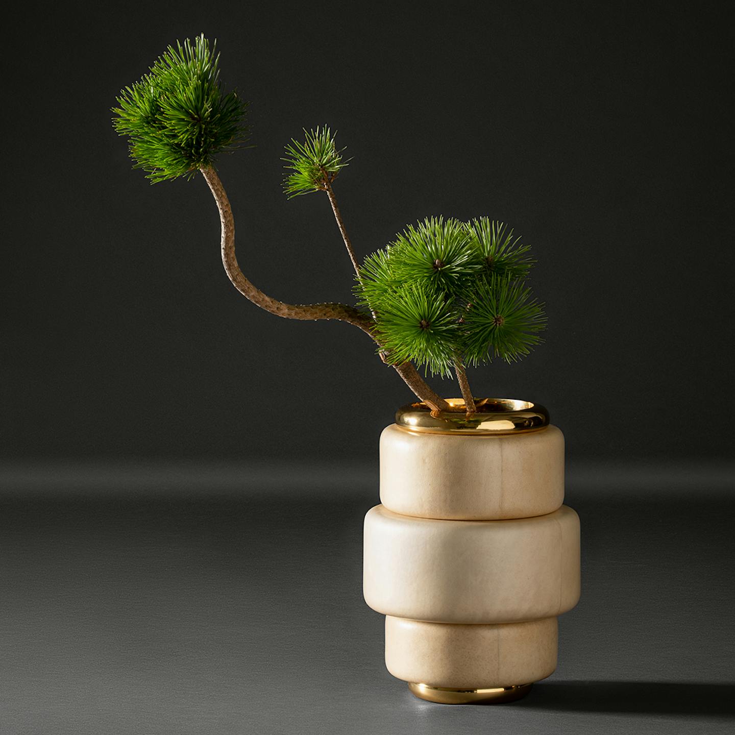 Round rings of grained ivory parchment are wrapped around a voluptuous form that is finished and lined with solid polished brass.