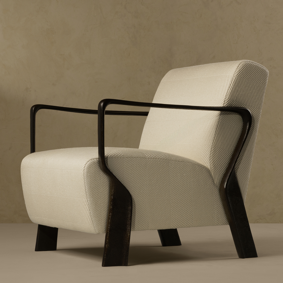 Sculpted simplicity. Bronze fins elegantly shape, lift and bridge to elevate the deeply comfortable upholstered seat of this chair. A subtle texture on the bronze makes contact with the frame pleasantly tactile. The fabric shown is a rich herringbone designed by Anne Corbière and woven in France using bespoke linen and silk yarns lending a luxurious depth and handle.