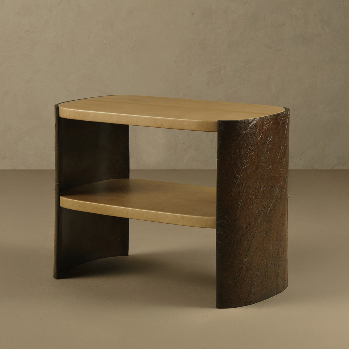 Golden parchment paired with bronze patinated in deep autumnal tones. A simple and practical shelf side table for a seating area. Good proportions are delightfully detailed with a relief of falling leaves.