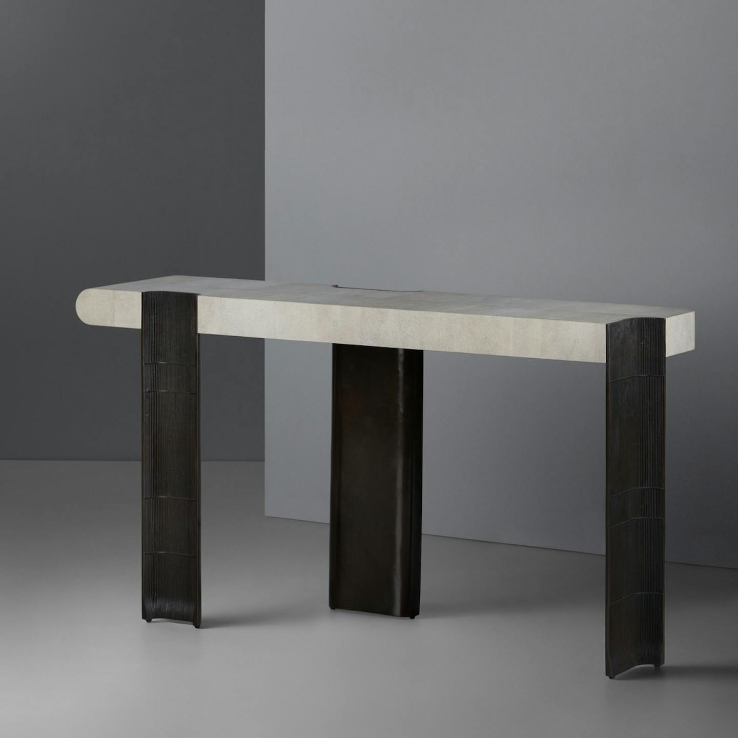 Elegant from all sides, Corteza explores notions of materiality and structure through luscious textural surfaces. Carved bronze concave pillars that echo the lines of rye straw, support a flowing volume of Natual Speckle or Natural Distress shagreen. Designed by Alberto Vélez for Alexander Lamont.
