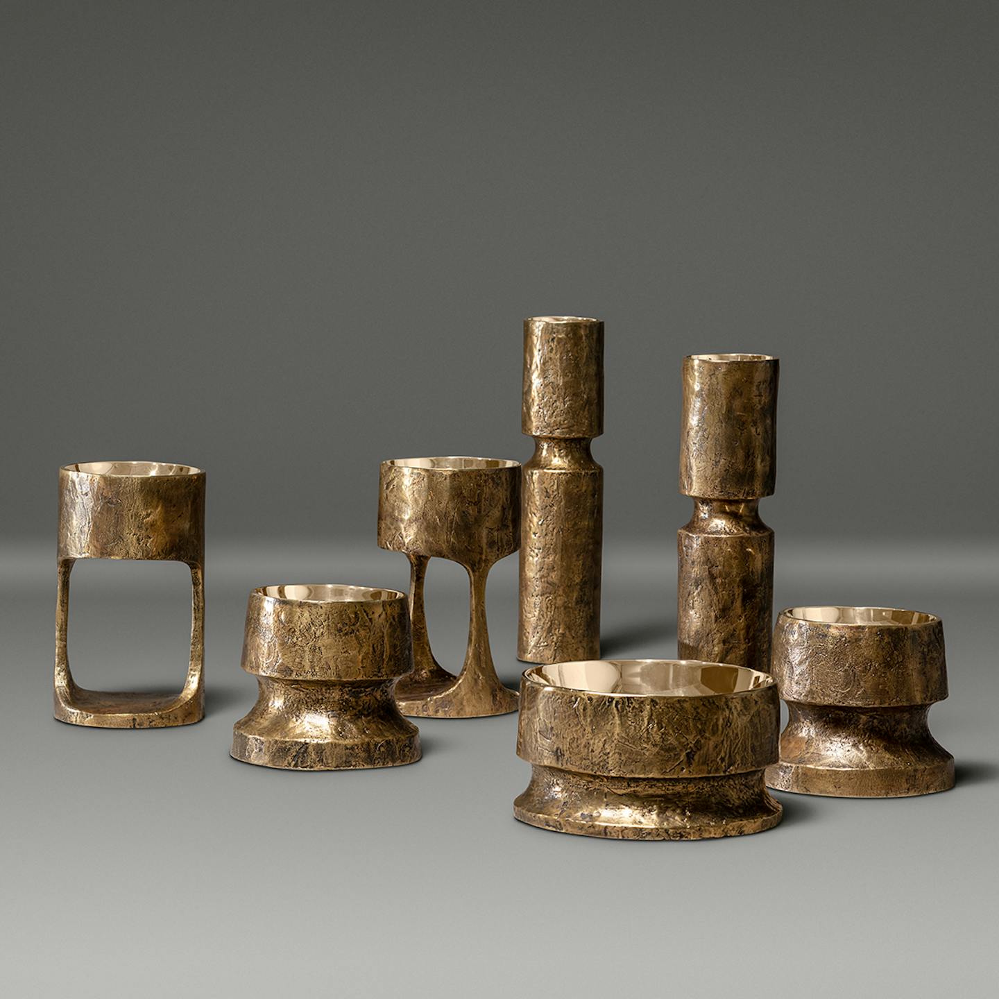Perfect, smooth reflective dishes hold naked flames within deeply textured patinated brass table sculptures.