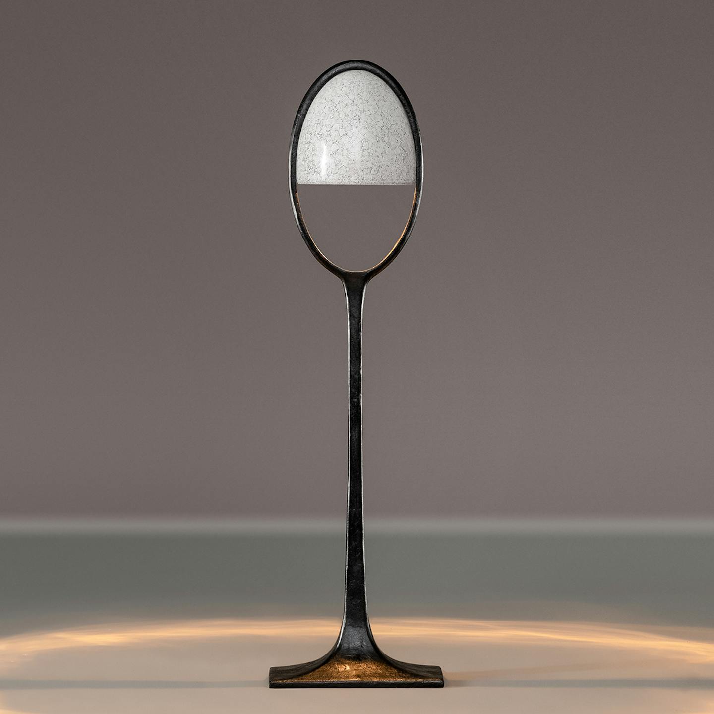 An elemental form is rendered in striking textures and finishes. A cast brass dome is entirely covered in lacquered eggshell and suspended inside an oval void and lifted by an elegant tapering stand to create a hauntingly beautiful ring of light.