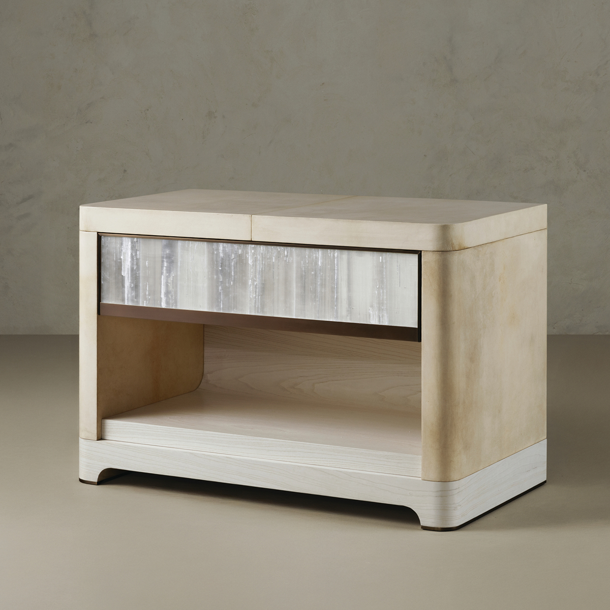 The soundest sleep is had when one feels enveloped in security, softness and quiet. The generous elements of the Divan nightstand are themselves wrapped in parchment - a soft, natural material. The lower shelf has a stepped platform and soft cove veneered with a special open-grain ivory wood. The drawer-front is overlaid with raw gypsum - a loved material of the 1920's - that is edged with solid brass. Inside the drawer is a deep verdigree green leather.