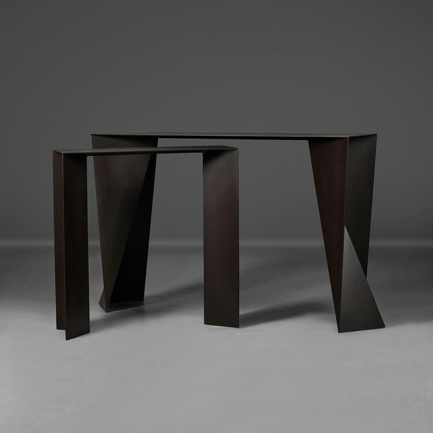 Two forms interract together. Etched steel gives durability and a distressed monochrome sculptural aspect. Surfaces vary due to the hand-applied nature of the etching process. Also sold individually.