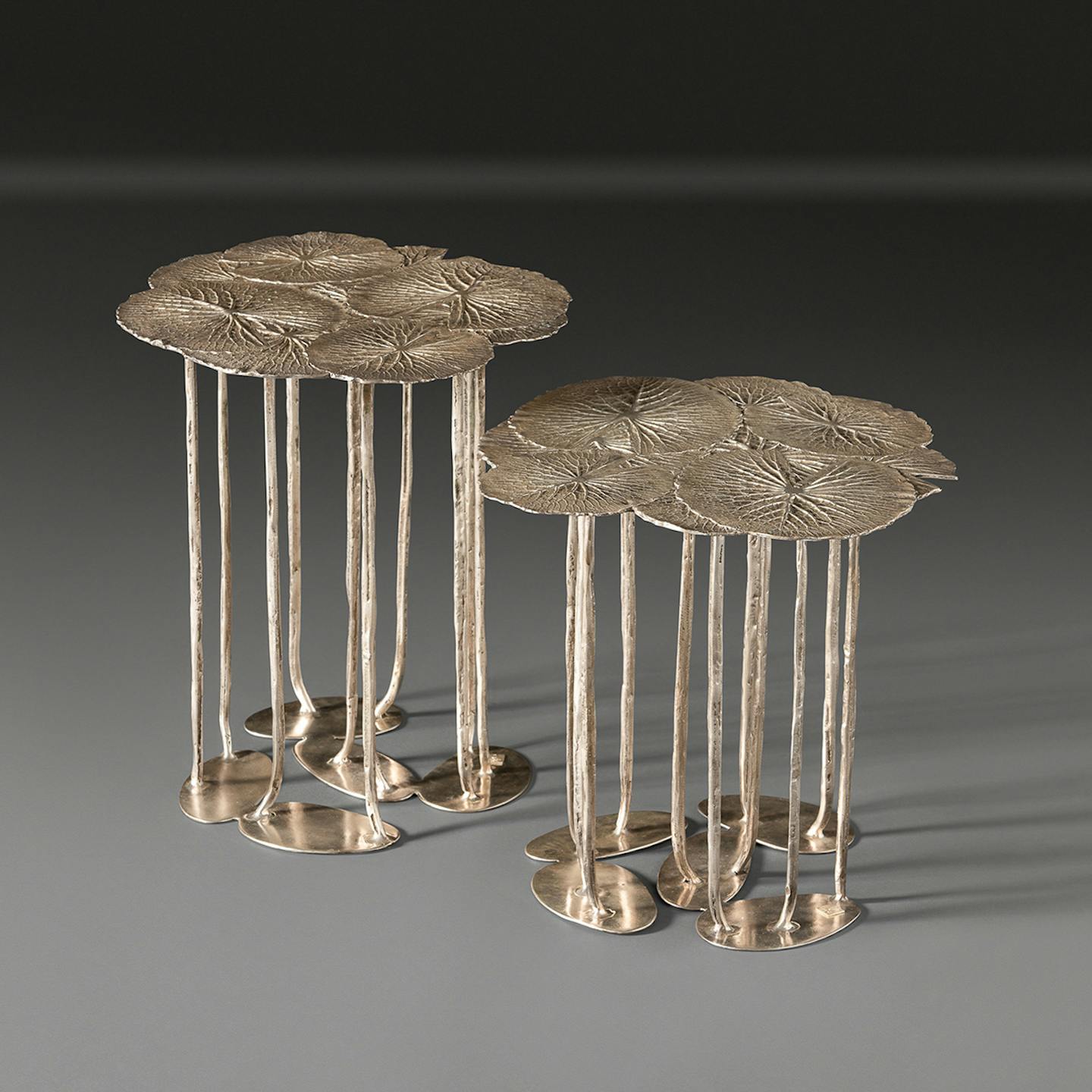 Silvered lilypads floating on stems form a pair of whimsical side tables. The tables are beautiful alone or as a pair.