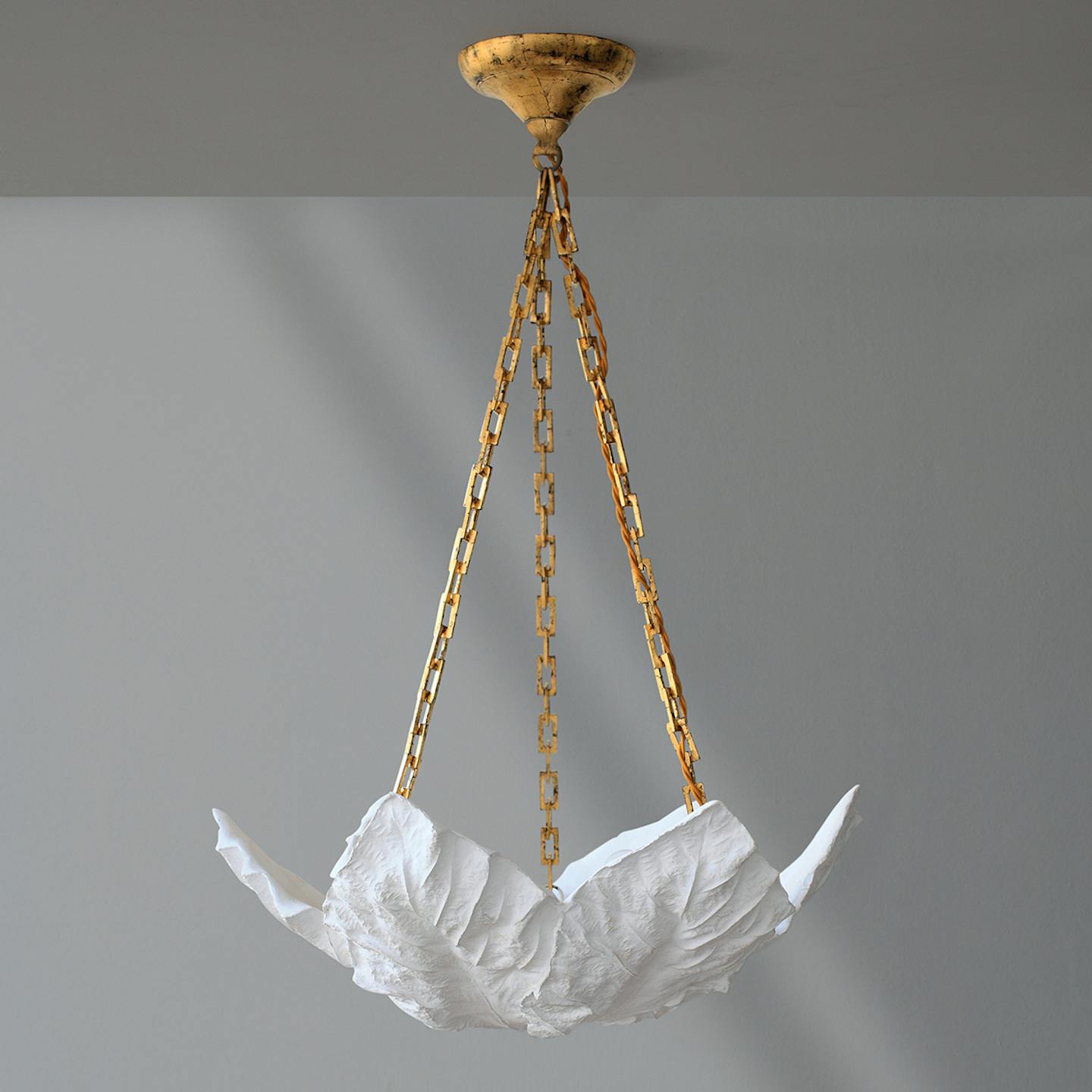 Leaves floating down from the ceiling. Teak leaves overlapping in plaster are suspended by three square-form chains available in gilded brass, black bronze patina or polished brass.