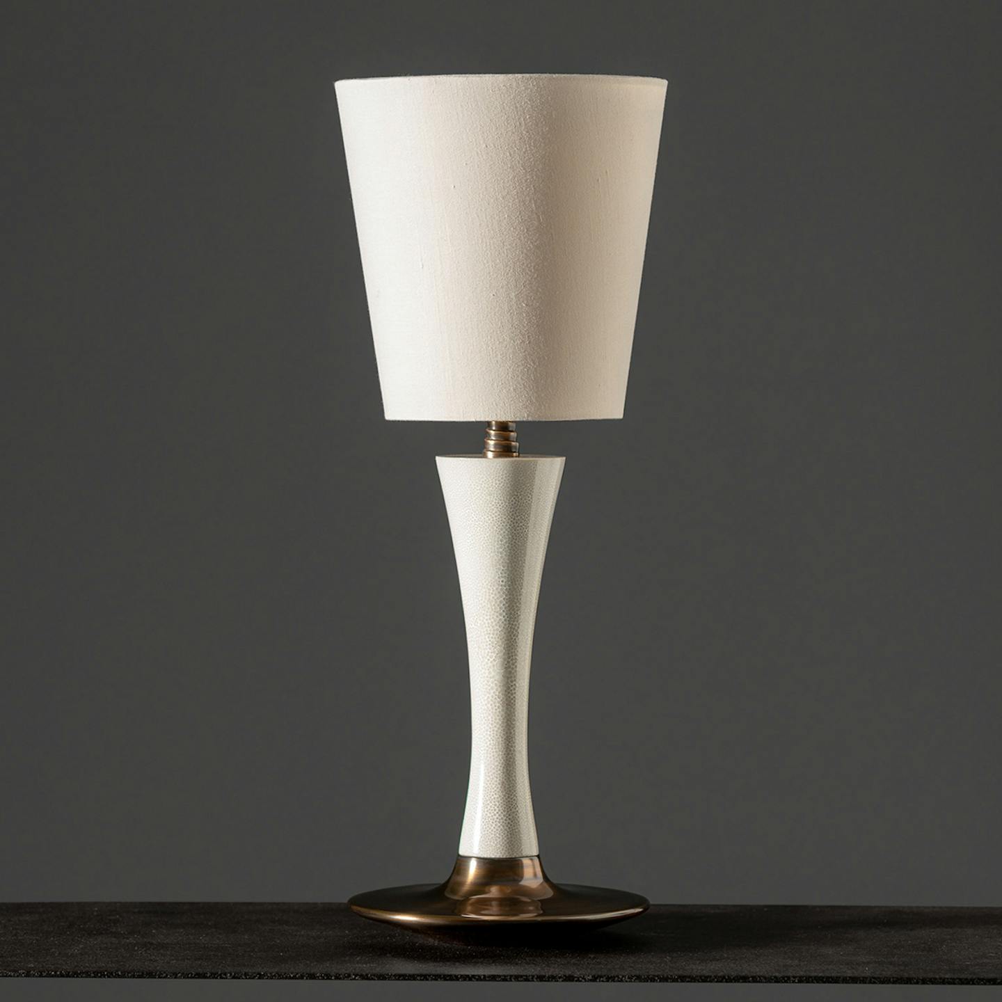 A lamp inspired by the beautiful form of the Japanese 'warosoku' temple candle. The lamp is made in ‘Ivory over Ivory Shagreen' – ivory shagreen which has been lacquered white. Finished with a smooth patinated base and inverted parchment or linen shade.