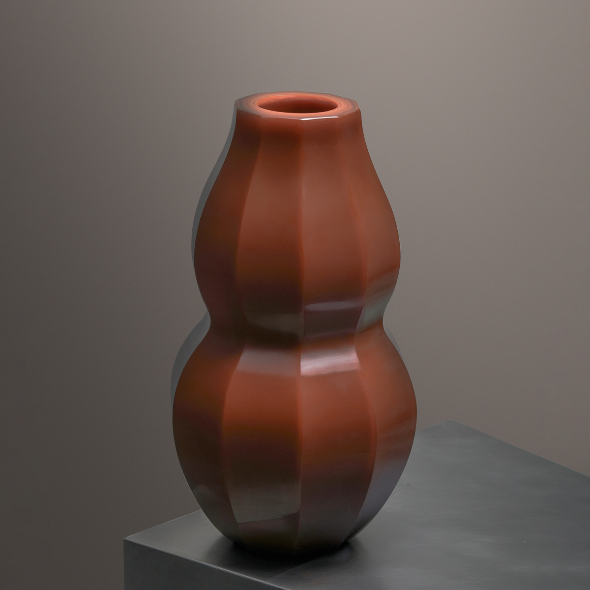 A gourd auspiciously shaped with facets etched from jade-cutting techniques, realised in a charmed yellow and burnt orange.