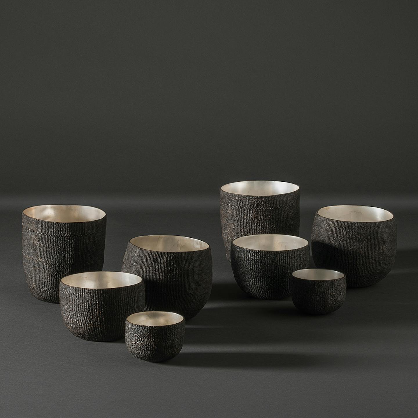 Bronze bowls inspired by African baskets. On the outside, these cast vessels have a dark woven texture while the inside has smooth pale silver leaf. Beautiful as a group.