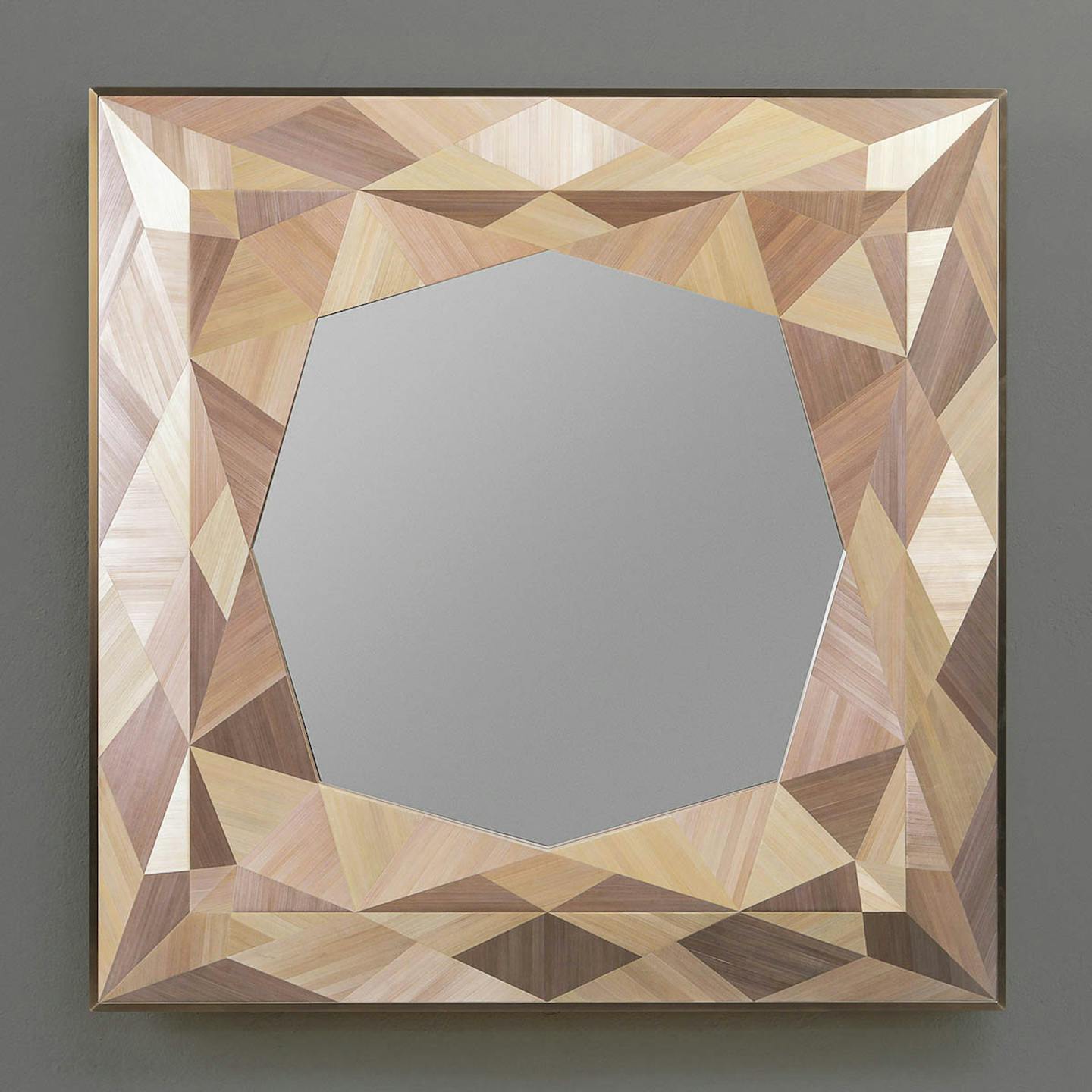 The Gemstone Mirror takes jewel-like colours and the reflective beauty of natural straw and applies it in a faceted pattern. The mirrors are framed by thick warmly patinated brass. Available in Burnished Metals Straw or Aqua Straw.