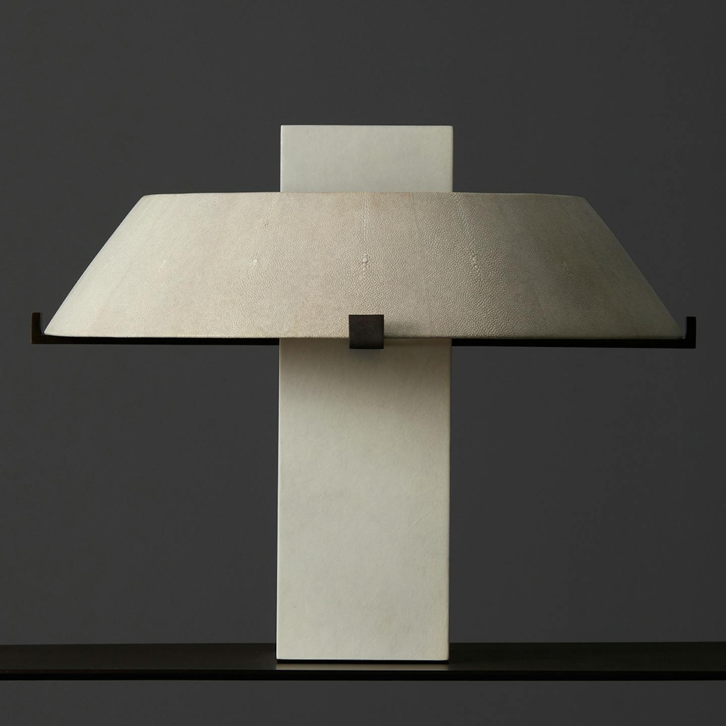 An Architectural form that mixes wonderful materials. An ivory parchment column with natural chocolate shagreen shade lined with pure gold leaf and supported by bronze arms. Four sockets hold up to 40W bulbs.