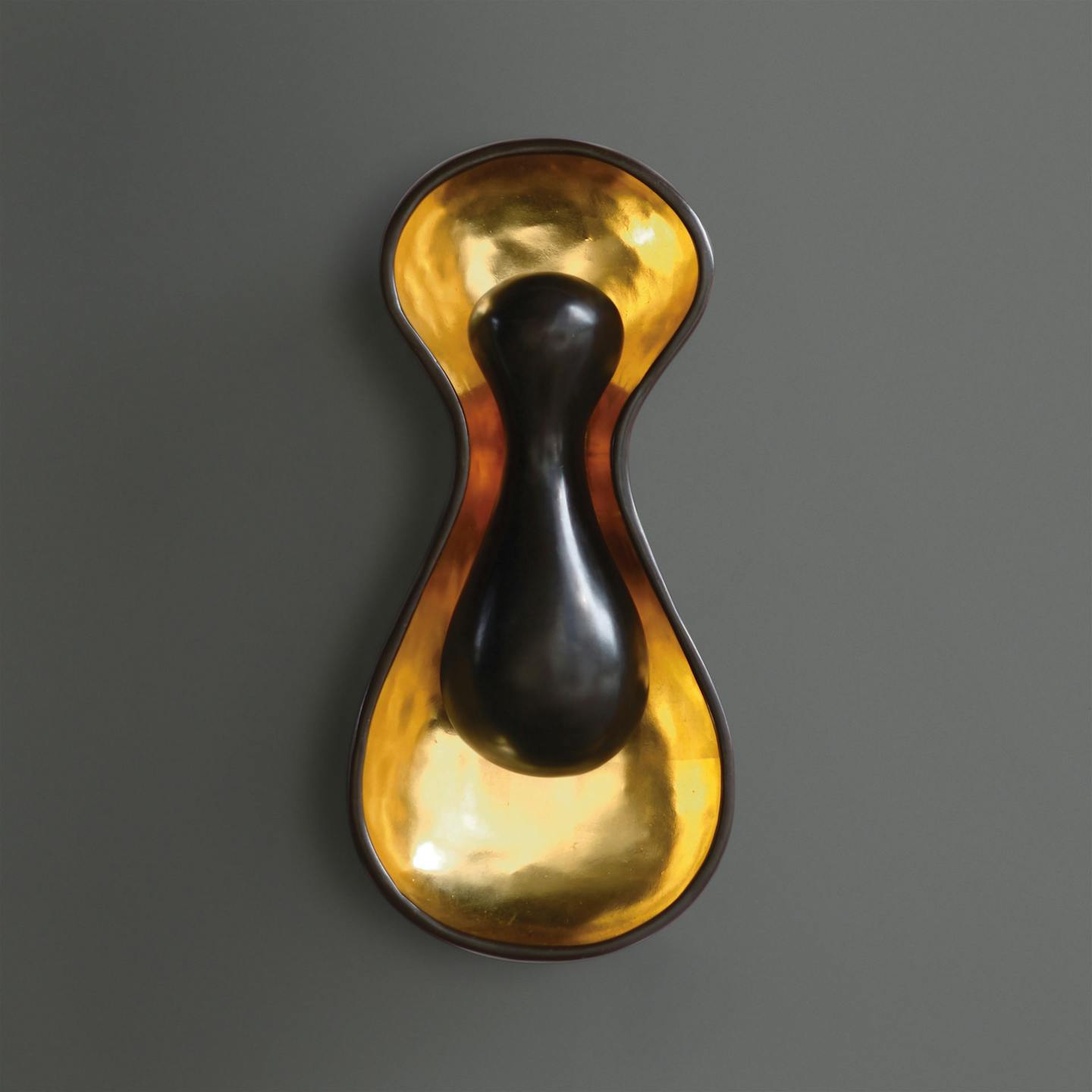 A voluptuous form creates a lustrous wall light. The light is emitted from behind an inner droplet that ebbs into the lower space. Bronze with pure gold leaf interior.