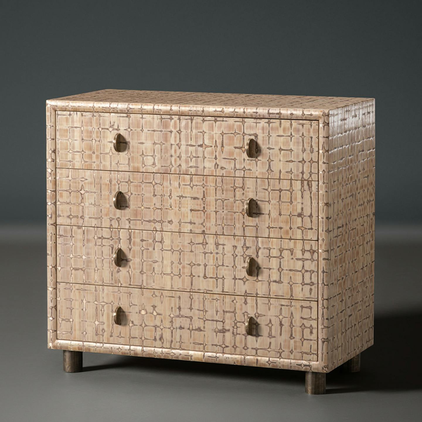 A surface of dappled Burnished Woven Straw lights up this chest-of-drawers in a special finish created in our studio. Layers of straw that have been carefully rubbed through create depth and reflection. Drawer handles in warm textured cast brass emerge from the surface. Soft-close Maple drawers are lined with ivory leather. Back in Maple.
