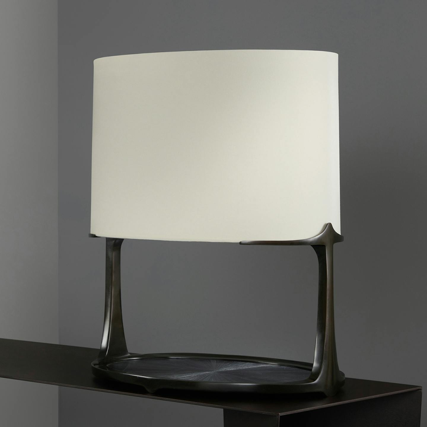 An oval shade floats above a sunburst of straw marquetry or shagreen that catches and reflects the light from the double-head bulbs. The tapering structure is cast in dark bronze.