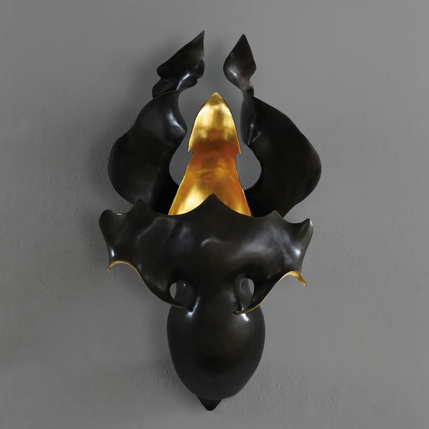 A powerful bronze orchid propagated to live on a wall emits a striking light and form. Wrapped in its petals and delicate gold-lined folds the Labellum is a unique piece inspired by the beauty and architecture of rare orchids. From an original sculpture by South African sculptor Astrid Dahl for Alexander Lamont.