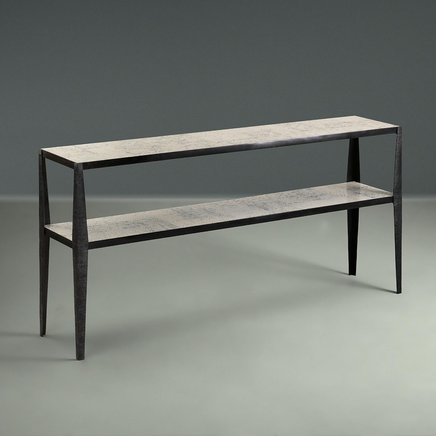 Lattice console and side tables are minimalist, relaxed designs. Carved bronze legs reflect the light while the table surfaces are covered with a lacquer-rubbed surface developed in Alexander's studio.