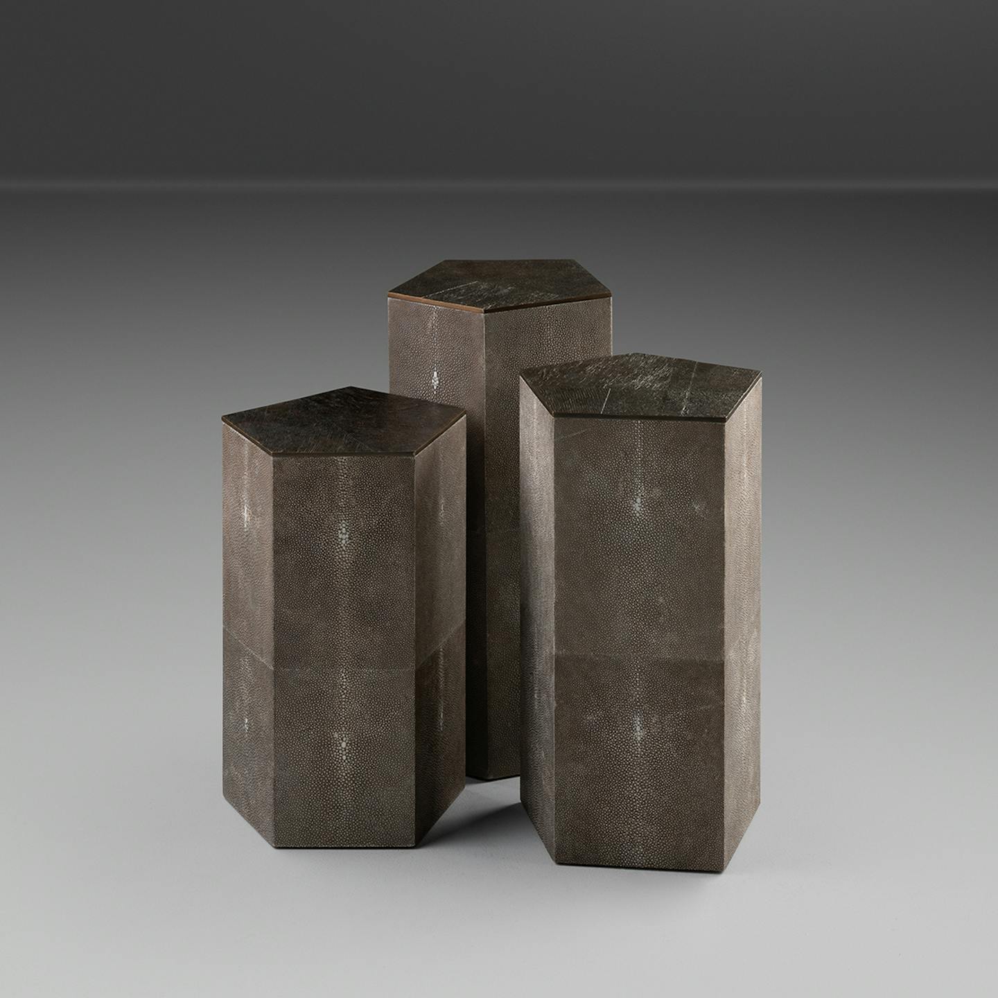 Irregular prisms that sit comfortably together or easily apart. Inspired by natural rock formations, these accent tables are made with raw shagreen and topped with textured cast brass. Available in soft yellow, natural chocolate or custom tones.