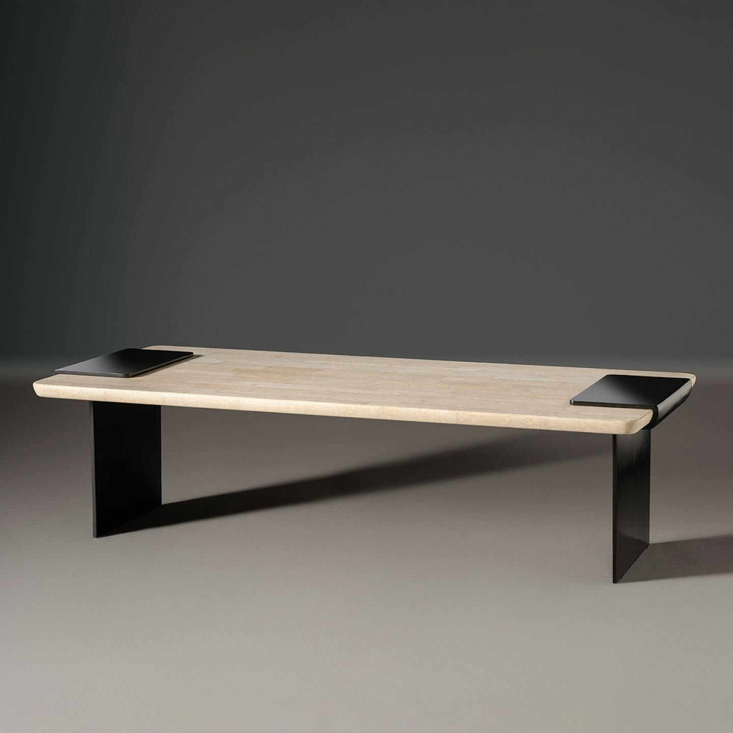 A luxurious plain of shagreen to lie at the centre of the room. Powerful bronze legs clasp and lift a top of muted, unpolished raw stingray skin; a by-product of the fish industry and one of the most celebrated decorative materials in the world.