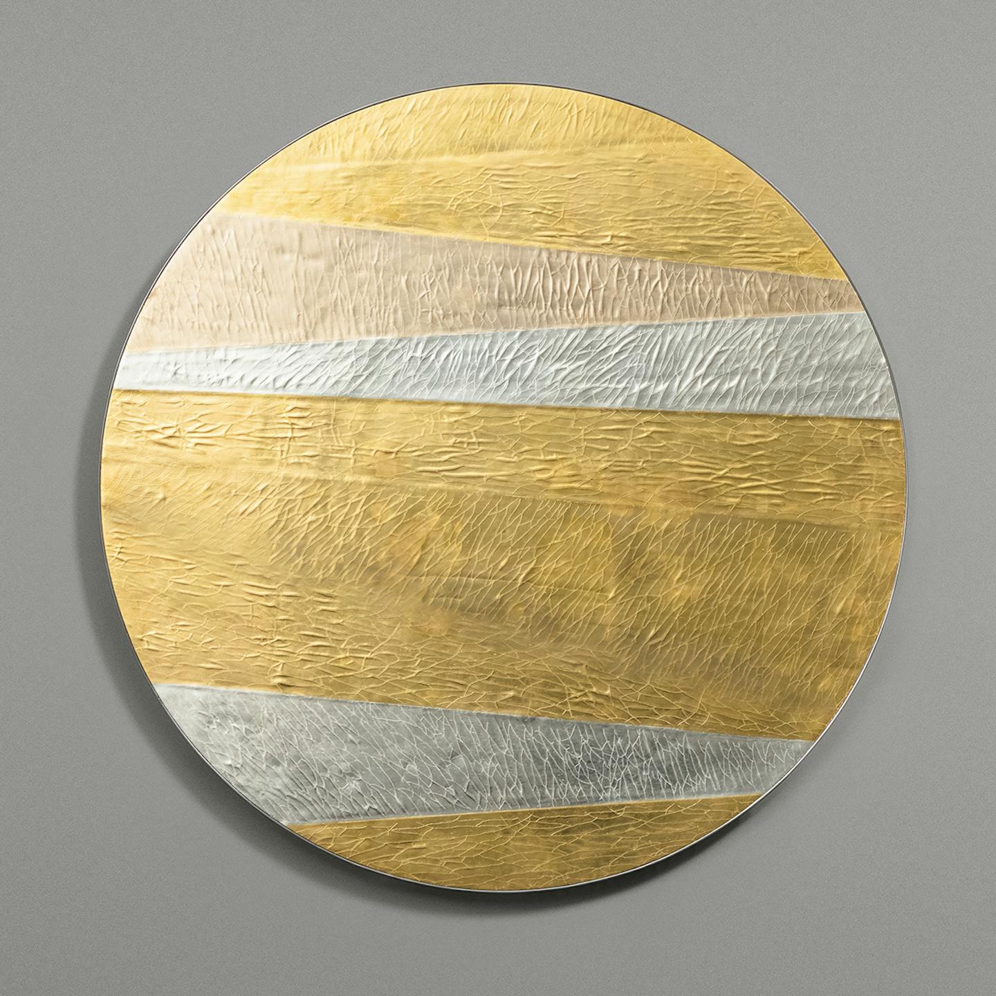 A Siamese moon on the water that gently ripples in the breeze. Precious leaf in varying tones covers a gently cracked gesso.