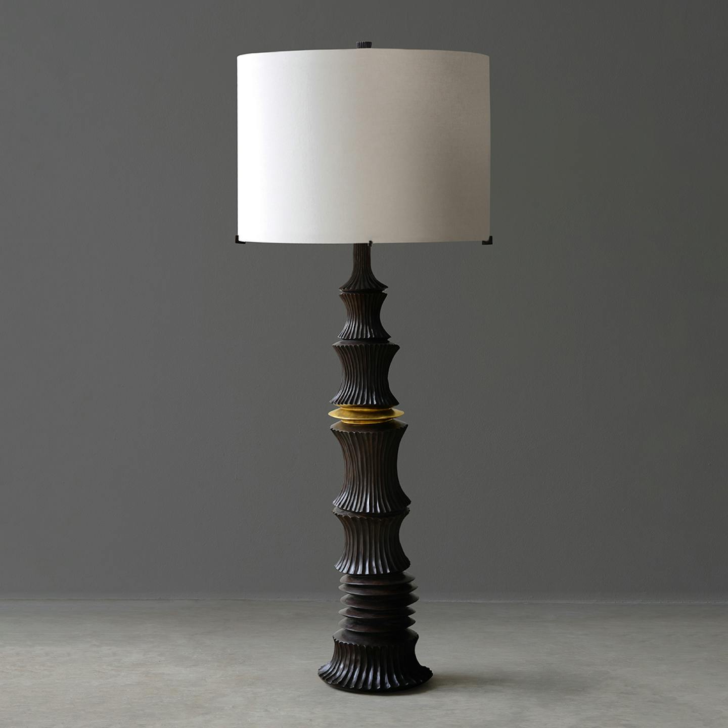 Inspired by the idea of building with stacked irregular objects curved on every surface; an impossible task. The play of movement, balance, tension and texture creates a sculptural yet whimsical floor lamp. A single gilded disc adorns the centre. Linen shade.