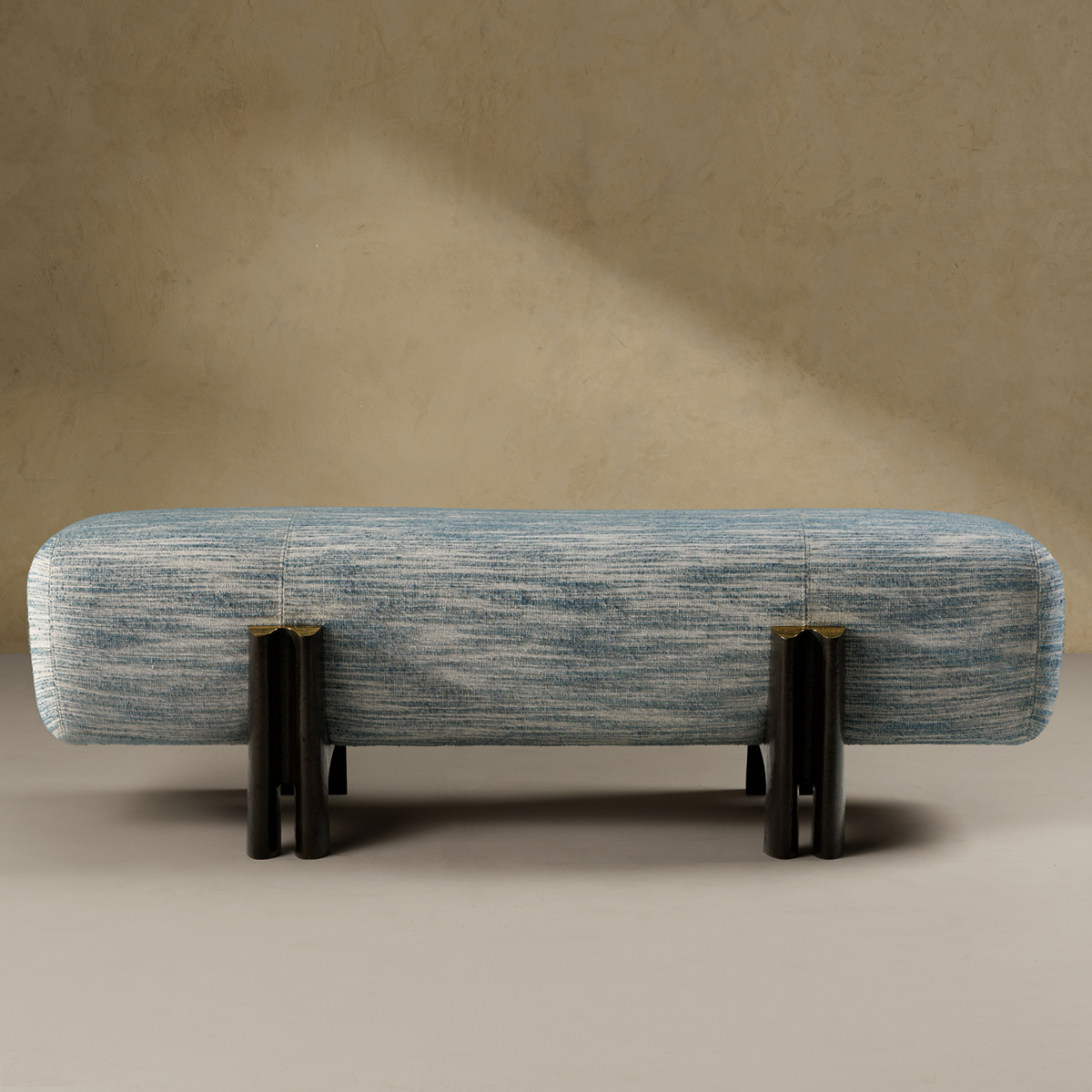 Part of the Ondas group, this bench is raised on textured and polished cast brass legs that emulate the rise and fall of a wave or ondas in Spanish. The generous proportions are very comfortable for an arrival area, bedroom or hallway. Or even as a low part of a seating group. Upholstered in hand-woven silk.
