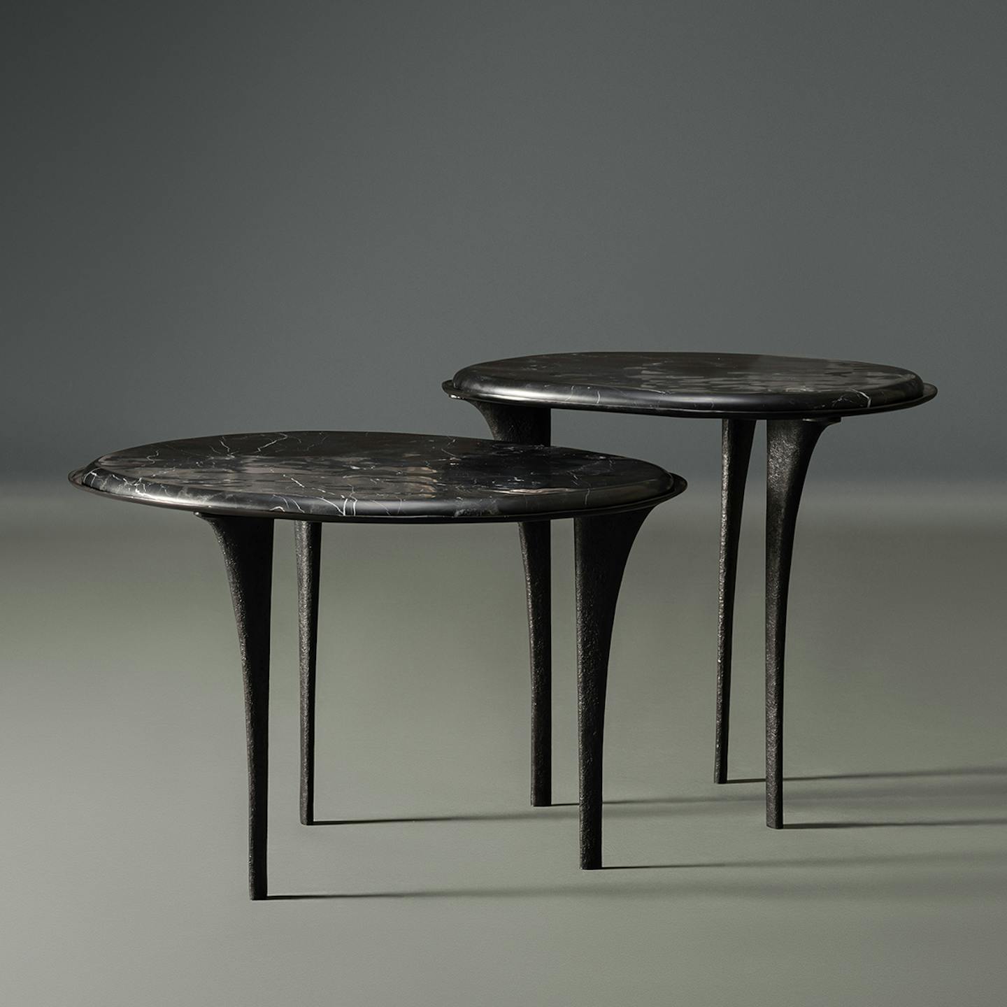 Onyx marble, full of unexpected inclusions, is honed to create a surface of character and sophistication surrounded by a generous irregular bronze frame. Tapering textured legs rise and swell as the tables interact.