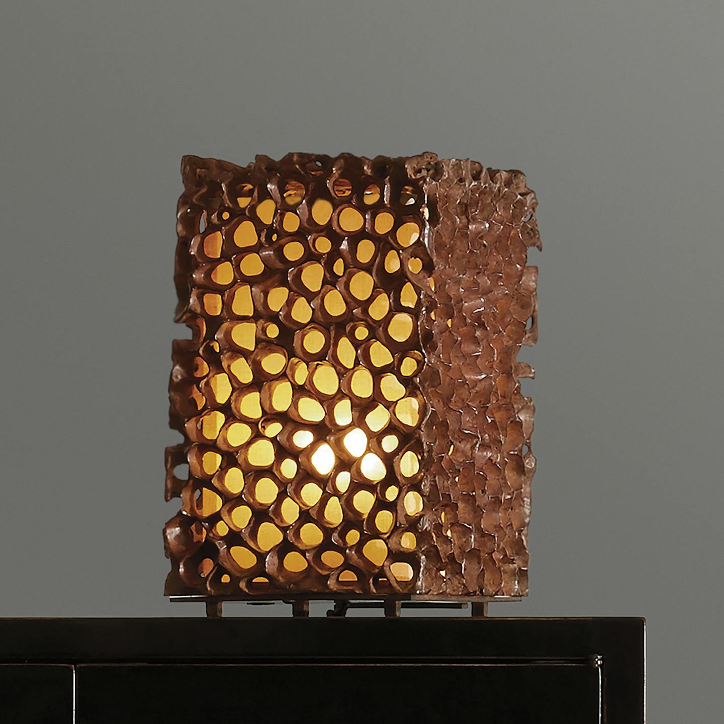 A powerful sculptural lamp in bronze that creates a sculptural drama of light, texture and shadow.