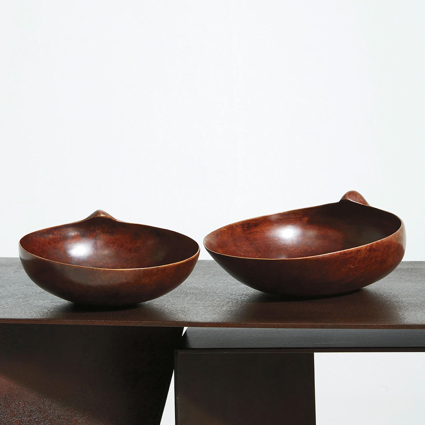 A pair of bowls that represent the beautiful curves and forms of shells. Finished with a patina that is applied by fire and hand that takes 6 days to build up.
