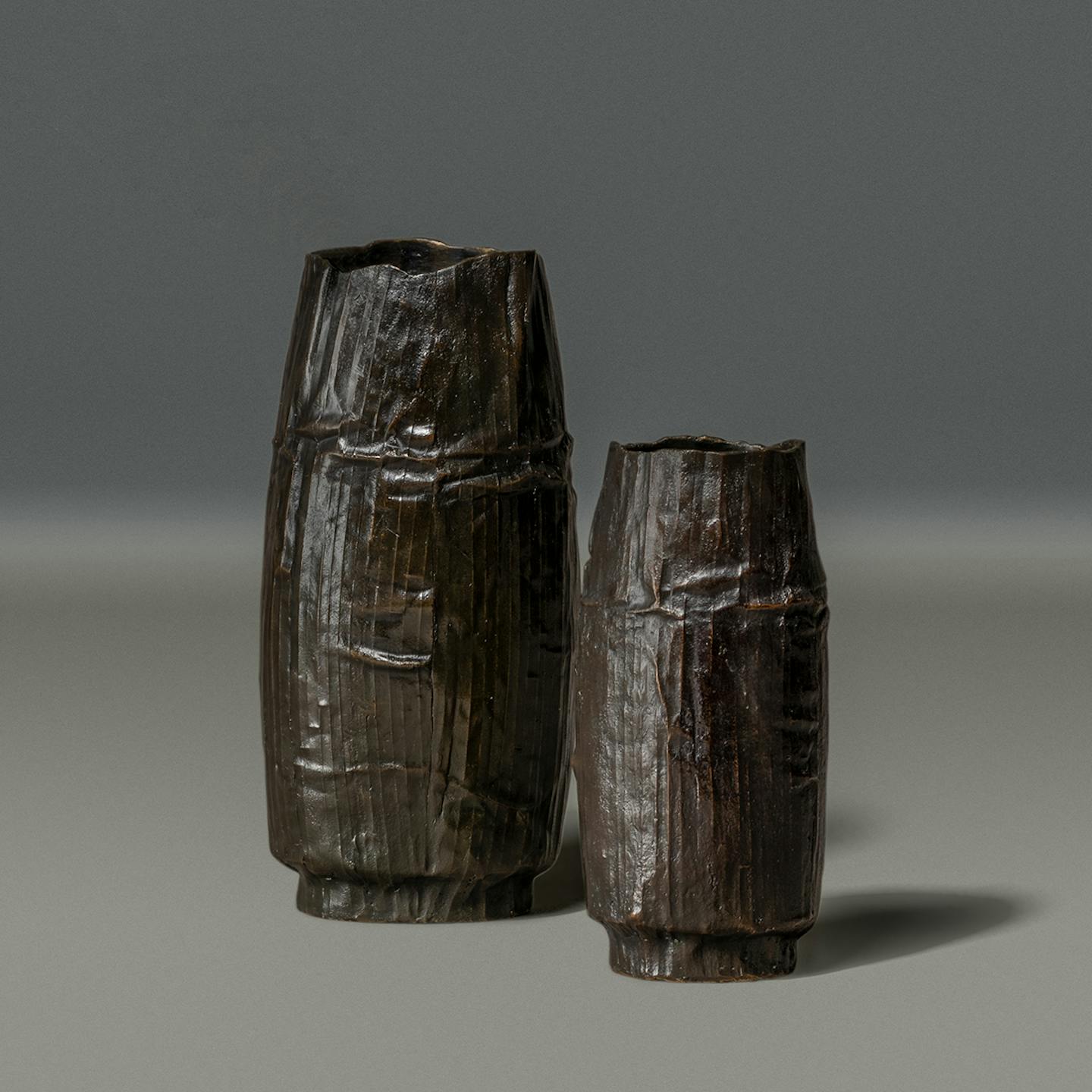 Bronze vases that were inspired by geology - depicting the layers and folds and crust of the earth in their texture.