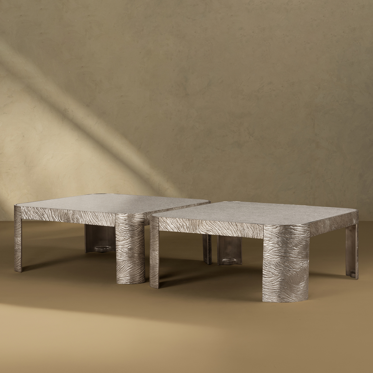 A table cool in summer and dappled in winter. Silvered mountain textures on the frame and legs bring an elegant rawness. The top is covered with eggshell that is layered with lacquer, evoking a field of snow. The tables were conceived as being grouped to avoid one large oversize surface. They can be paired or, make a larger surface as a set of four.