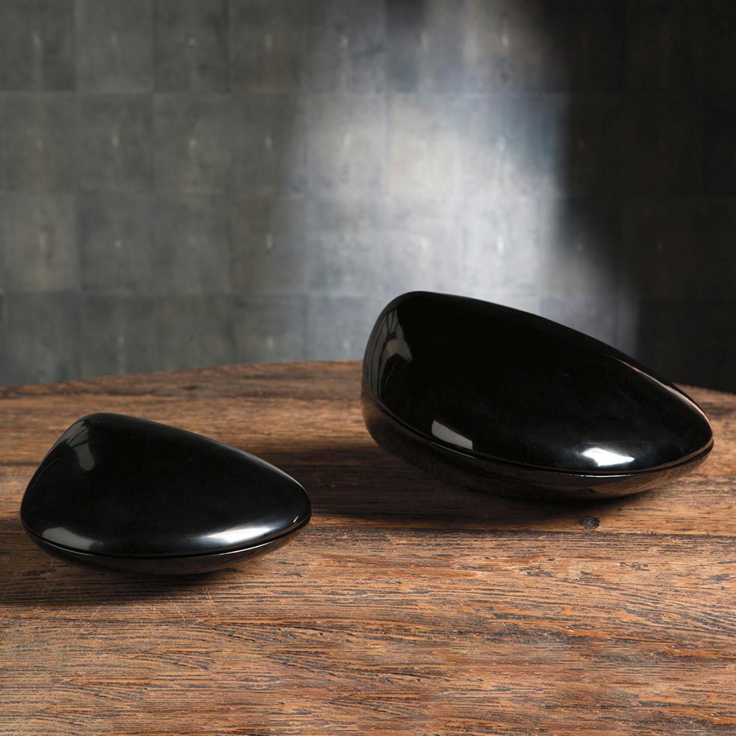 Hand-carved from solid wood into the shape of a clam shell, this deceivingly simple box is covered with many layers of natural black lacquer inside and out and sanded to make a perfect fit.