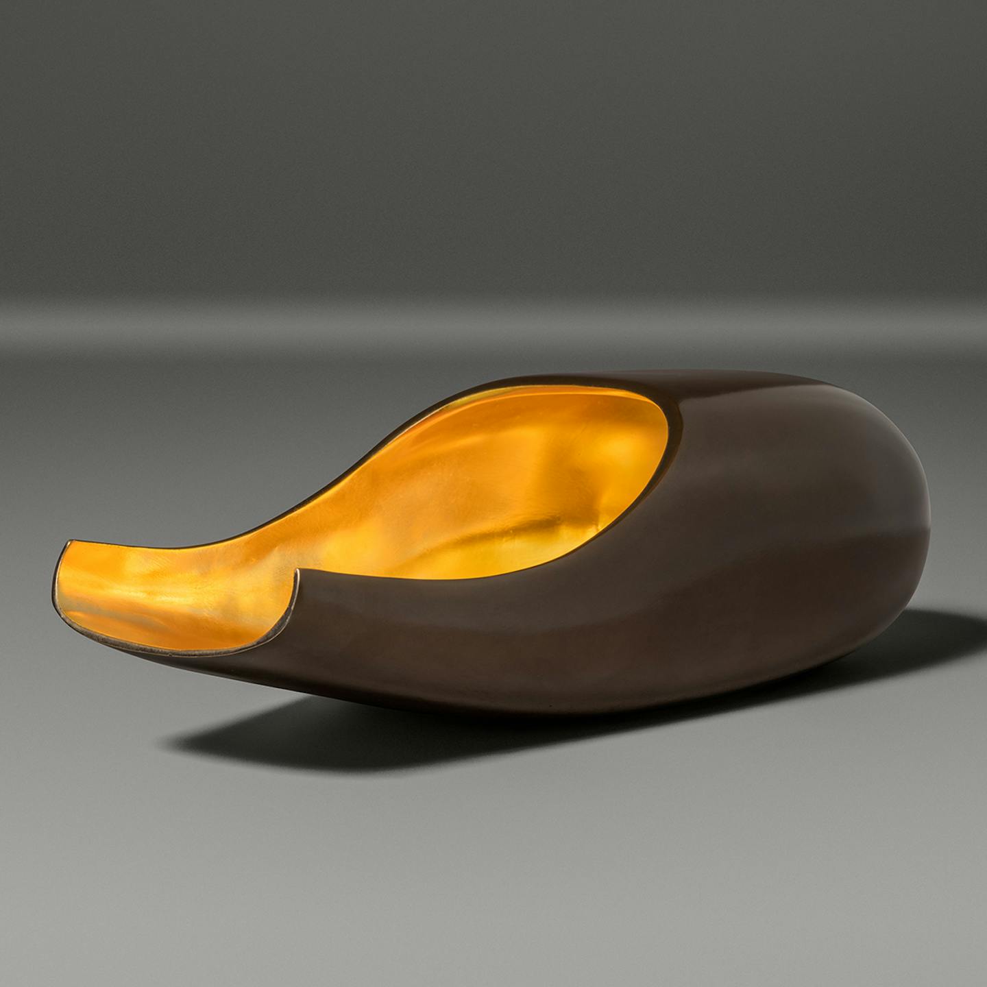 Like a challice, the gently curving form is modern but exudes a spirit of antiquity. Cast bronze vessel with dark patina and gold interior.