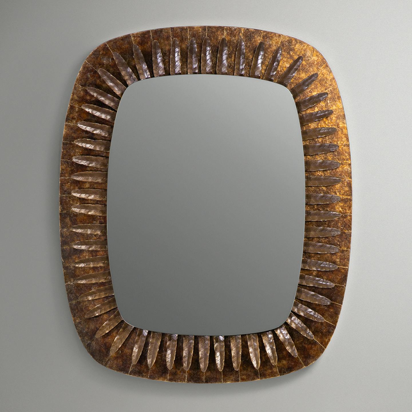 Tribute has a mica frame that shimmers behind bronze leaves and a 'floating' mirror. Ancient, like a Mayan headress, the mirror creates a sensual accent that varies in different light conditions. Available in Deep Amber mica with pale bronze leaves or Pewter mica with dark bronze leaves.