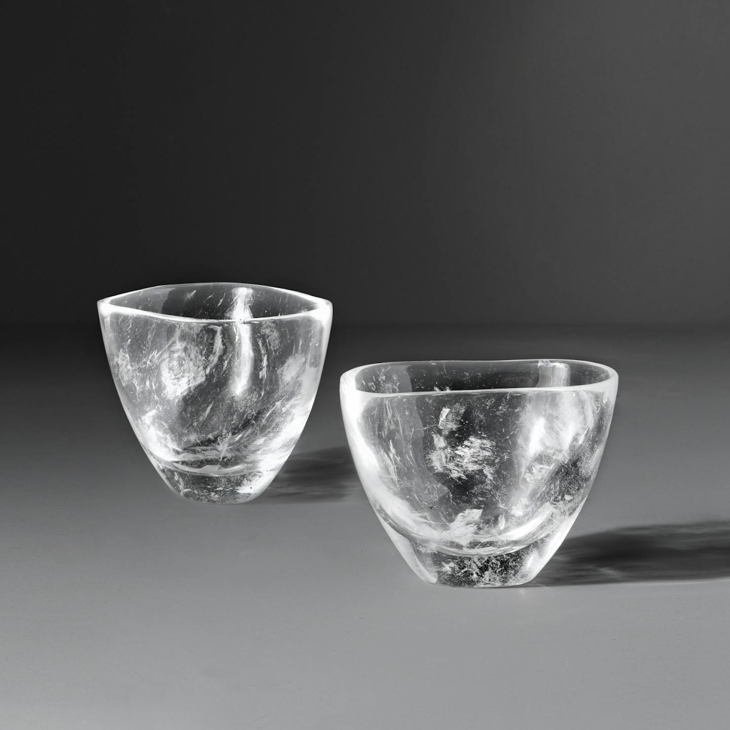 Wine glasses carved from solid rock crystal to create undulating luxurious drinking vessels that call to mind drinking goblets of antiquity while at the same time being strikingly contemporary and simple. Sold as a boxed pair.