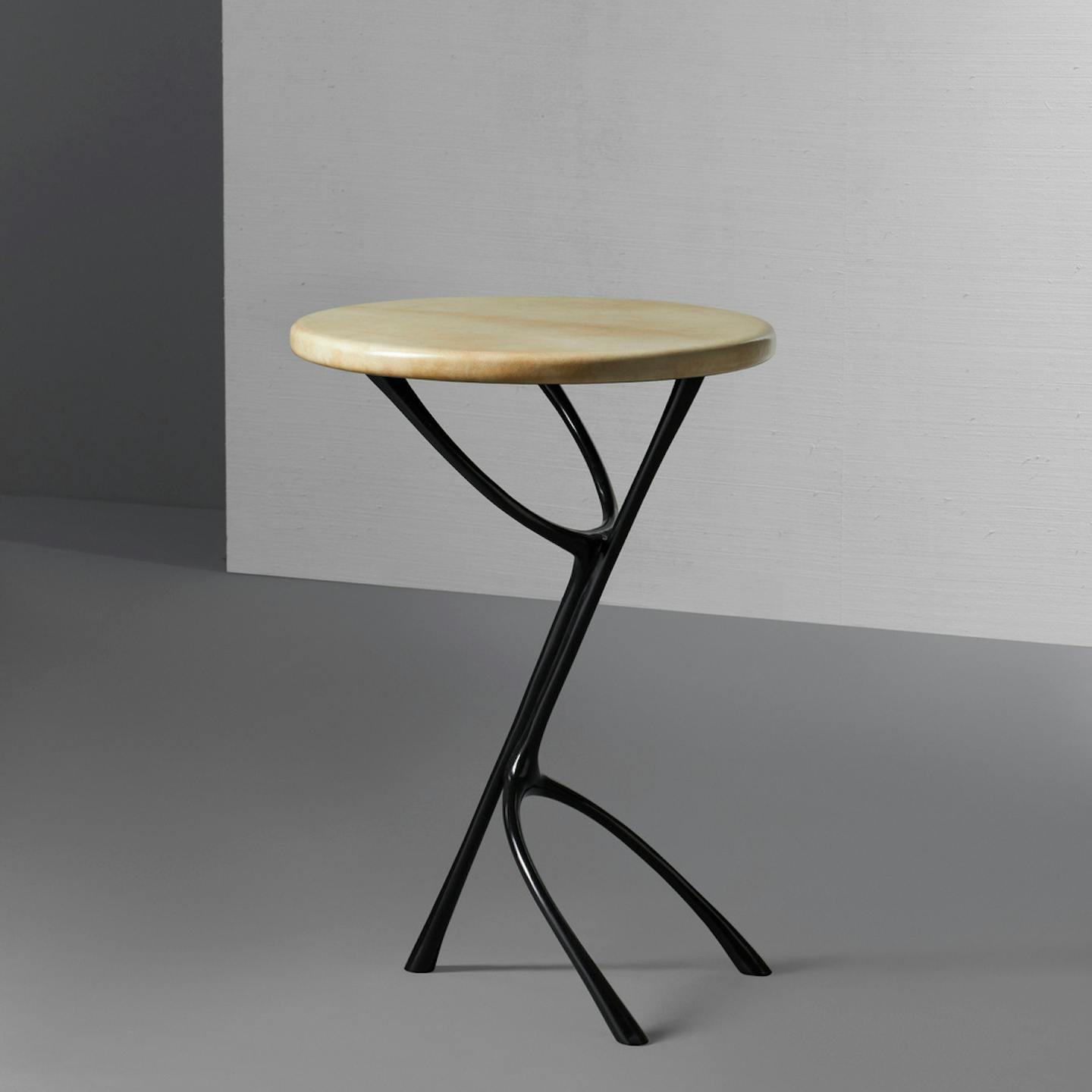 Elegant side table with cool Natural Parchment top raised on cast bronze legs.