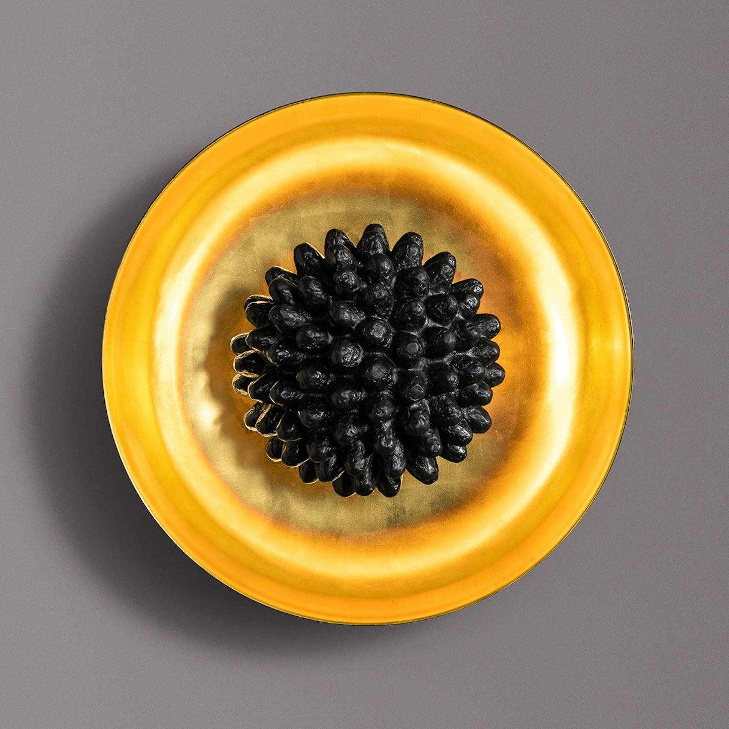 Gold light pours out from behind a totemic black bronze mace floating at the centre of a wide cast bowl. The sconce was inspired by ideas of power and belief from Africa.