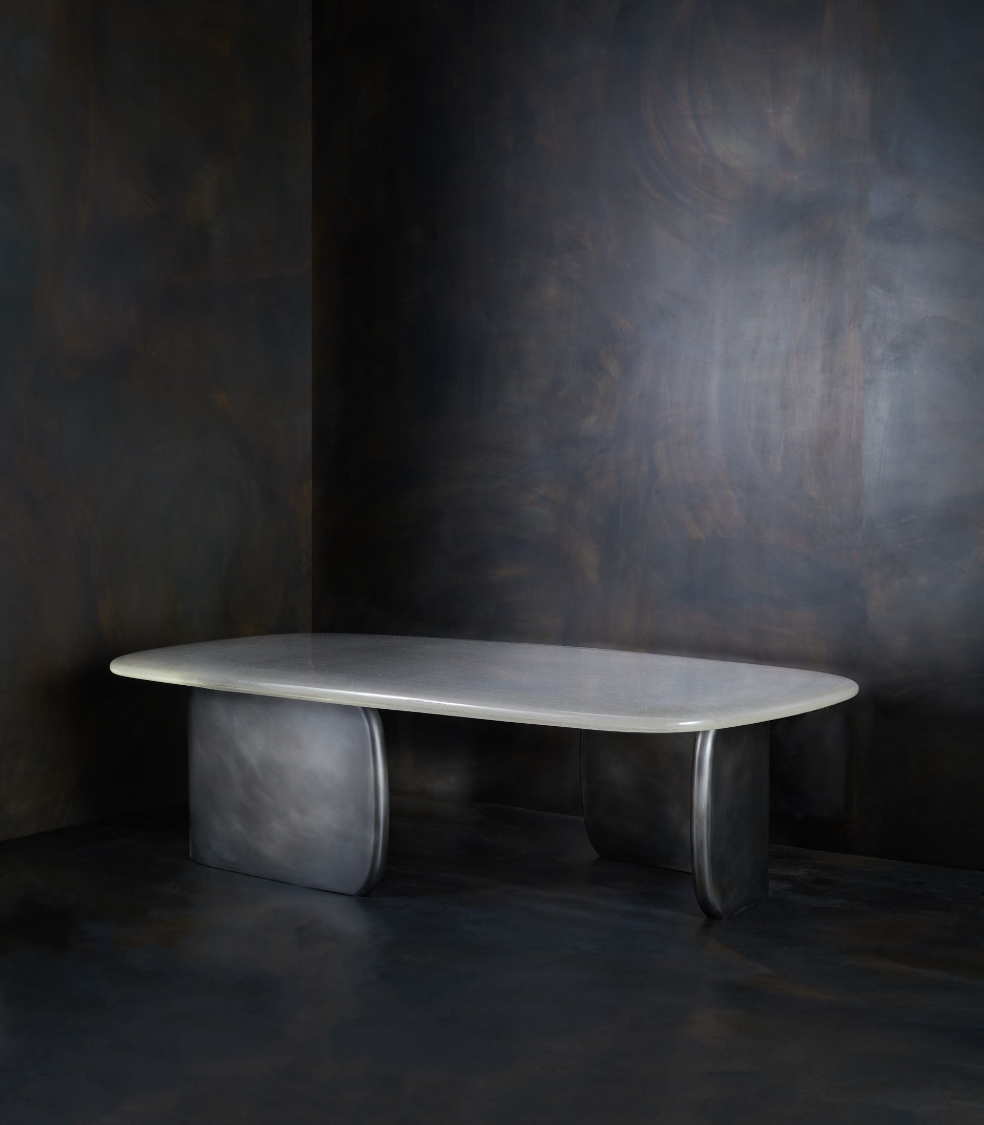 Hand poured, meniscus glass crystal table top on sculpted metal base with polished details.