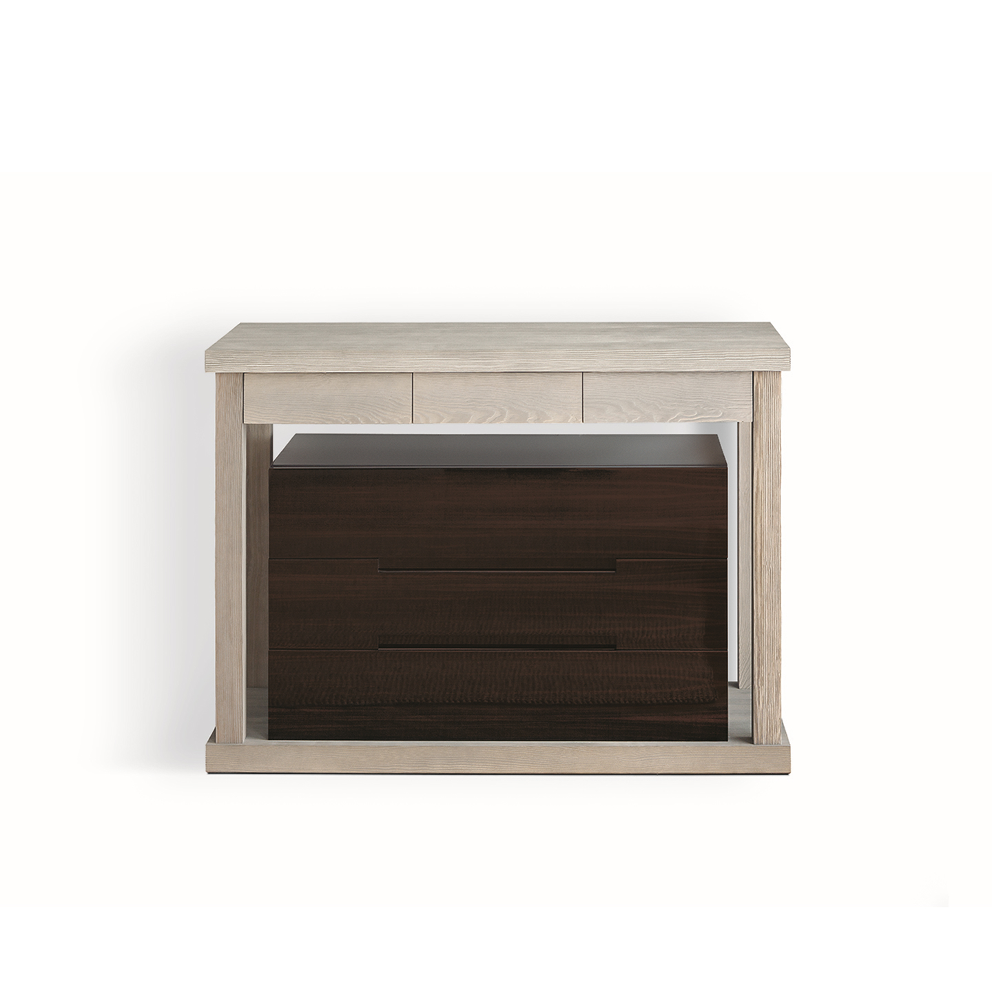 Console with outer frame in Pine, sandblasted. The outer frame features three drawers. The lower cabinet with three drawers is available in high gloss Walnut, Macassar Ebony or standard lacquer.