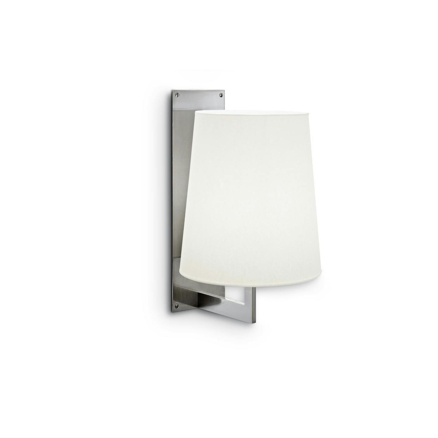 Metal wall sconce with an L-shaped arm and rectangular backplate, with spacers. Round, tapered lampshade.