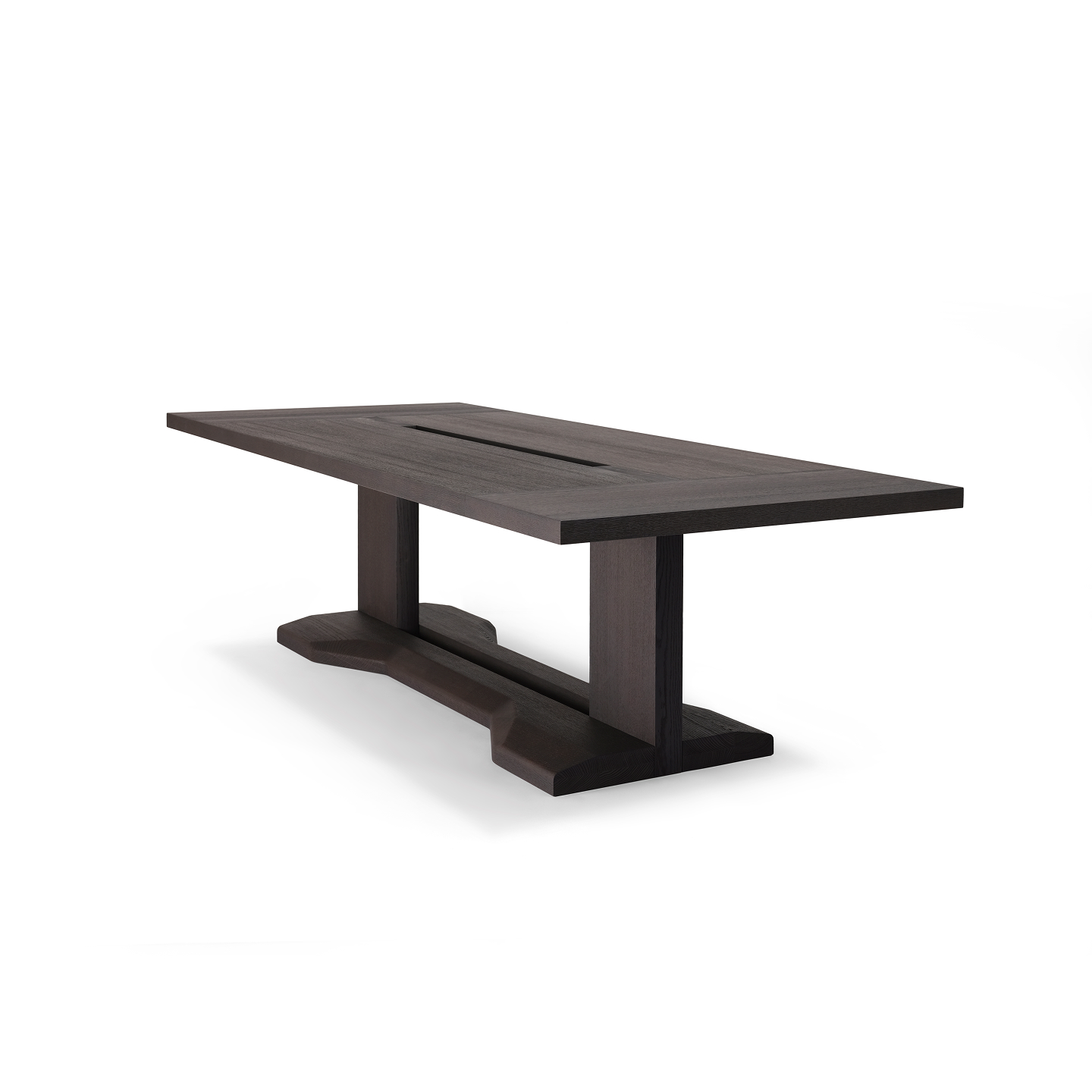 Dining Table with breadboard ends and decorative cut-out in the center of the table top. Top and shaped base in Oak.