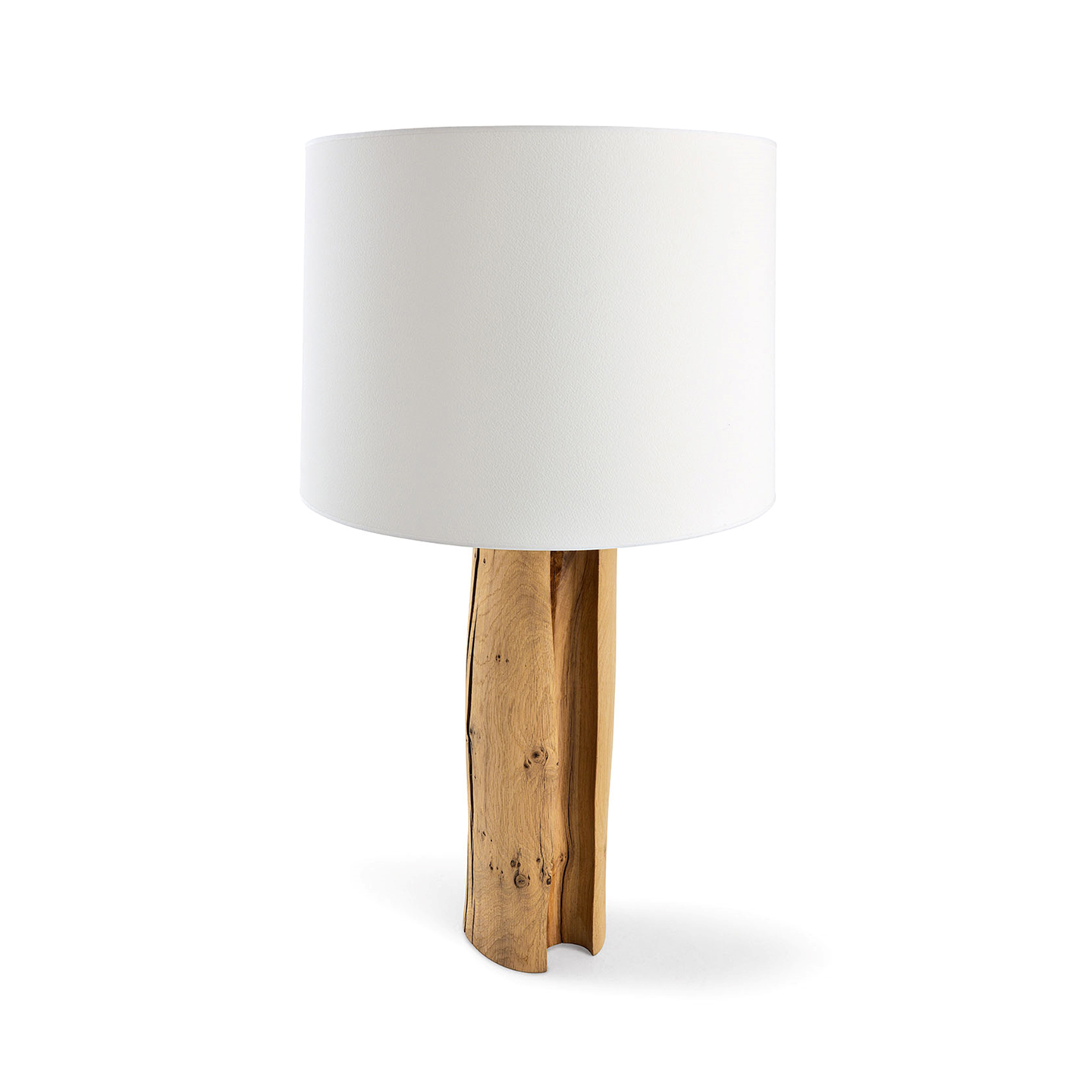 Table lamp with solid, natural, carved Oak base with high sheen finish in interior of carved area. Round, tapered paper shade.