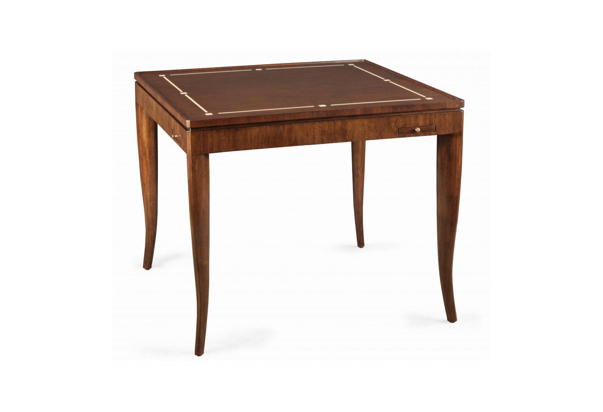 Inlaid backgammon well and reversible chessboard made of various wood inlays. Hand painted faux ivory detail on top.