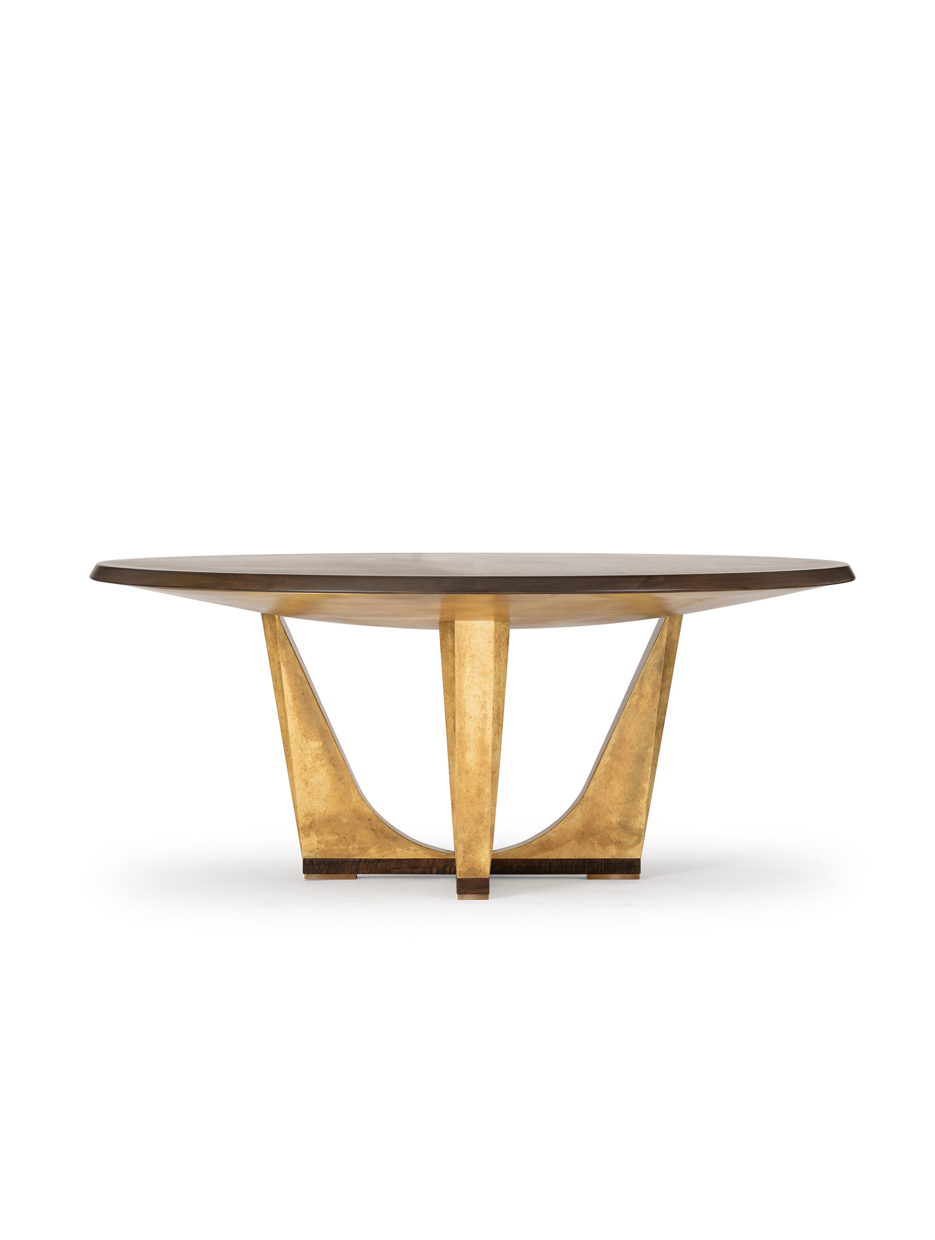 A gorgeous mosaic patterned veneer top contrasts its' striking base and gets accented with brass feet to create a classic, symmetrical form, with a modern presentation. Design by Neil Zuleta.