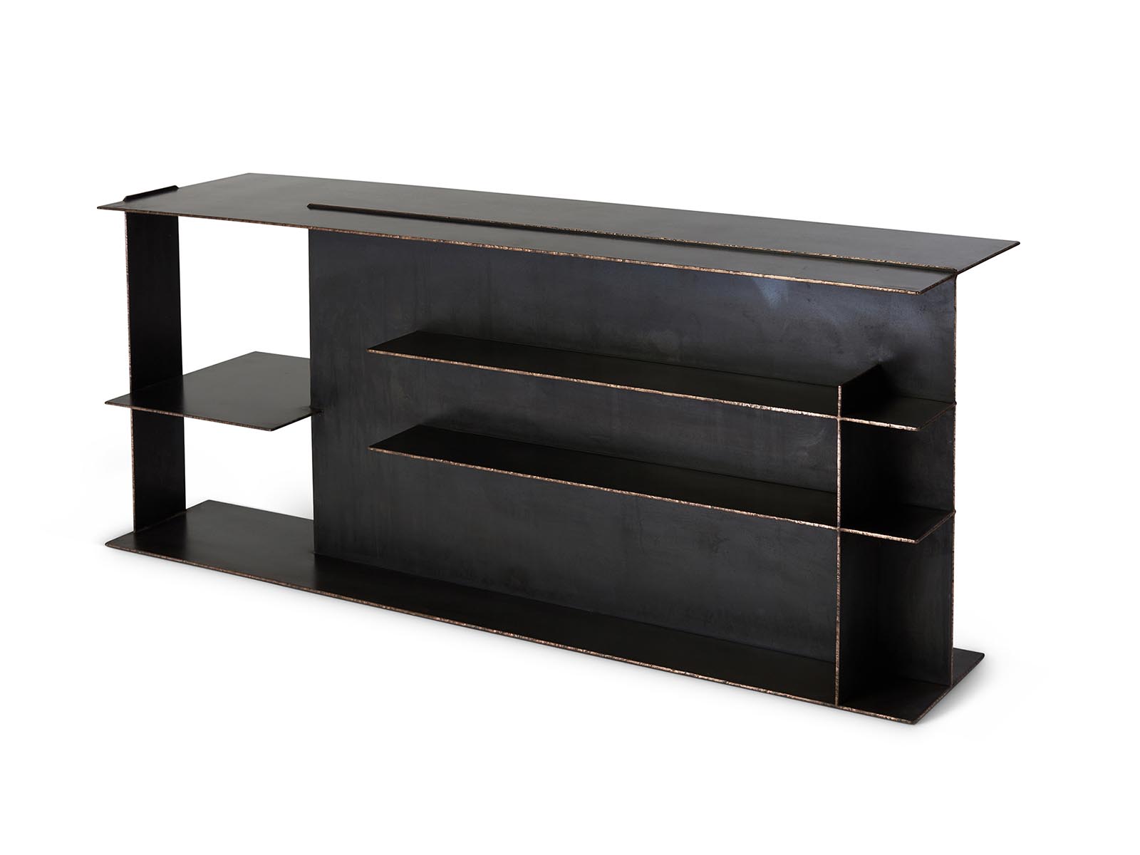 The console provides for display of books and objects while defining a more intimate space within a room.